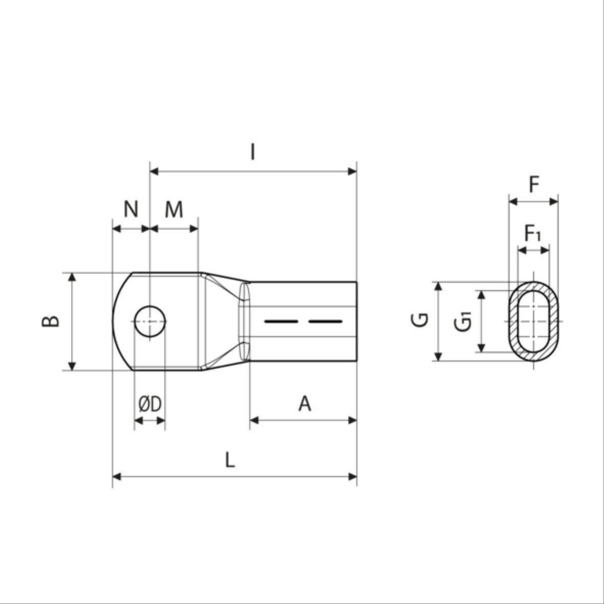 | tipo | 电缆截面范围 [mm²] | B [mm] | N [mm] | M [mm] | I [mm] | L [mm] | A [mm] | Ø [mm] | 电缆剥皮长度 [mm] | Ø1 [mm] | 槽孔接套内部高度 [mm] | 槽孔接套外部长度 [mm] | 槽孔接套外部高度 [mm] | 槽孔接套内部长度 [mm] | 最小包装单元 [pce] | 标准包装单位 [pce] |