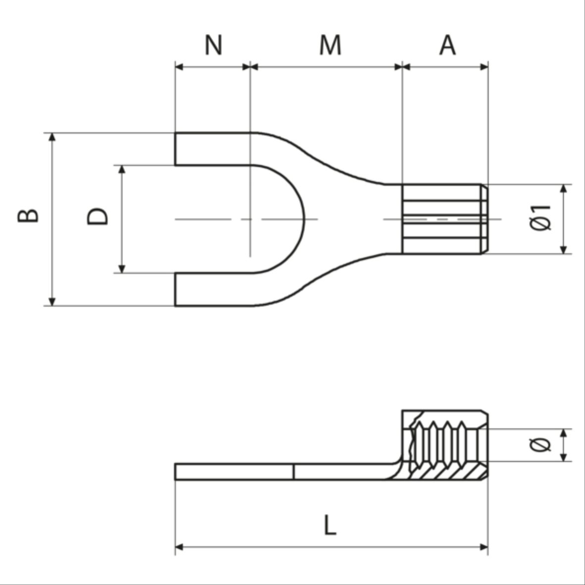 tipo 螺栓直径 B [mm] M [mm] I [mm] D [mm] N [mm] 紧固扭矩(建议值?UL?) (高导电螺钉) [nm] 紧固扭矩(建议值?UL?) (8.8级螺钉) [nm] L [mm] A [mm] Ø [mm] 电缆剥皮长度 [mm] Ø1 [mm] 标准包装单位 [pce] 符合ROHS标准