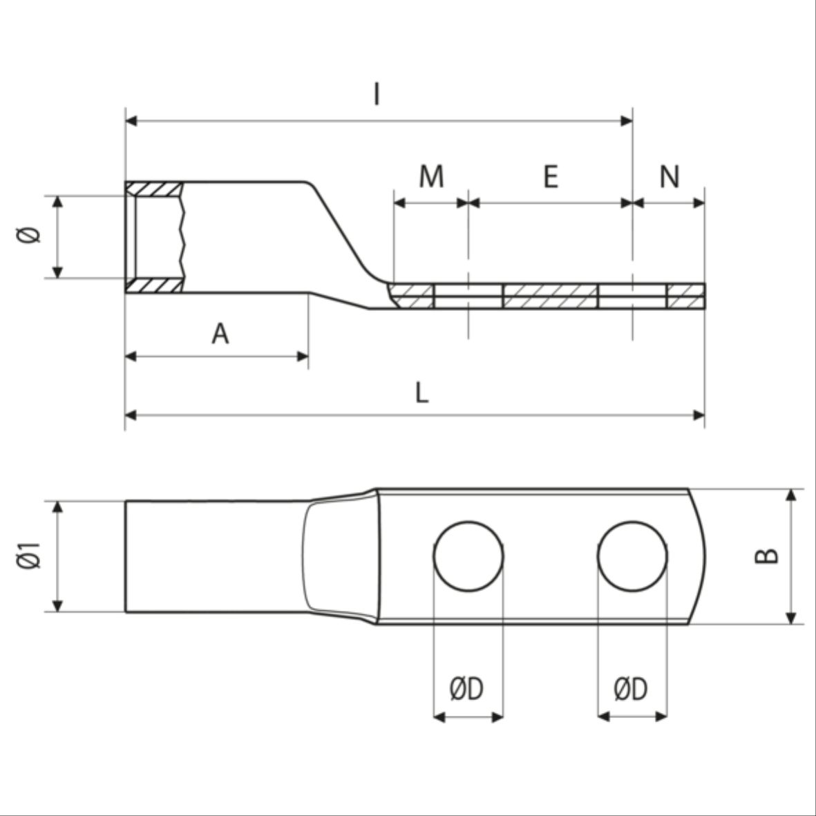 | tipo | 压接的几何形态 | 电缆截面范围 (低绞合) [mm²] | 电缆截面范围 (柔性) [mm²] | 螺栓直径 | ØD [mm] | B [mm] | N [mm] | M [mm] | I [mm] | 各孔中心距 [mm] | 紧固扭矩(建议值?UL?) (8.8级螺钉) [nm] | 紧固扭矩(建议值?UL?) (高导电螺钉) [nm] | L [mm] | A [mm] | Ø [mm] | 电缆剥皮长度 [mm] | Ø1 [mm] | 最小包装单元 [pce] | 标准包装单位 [pce] |