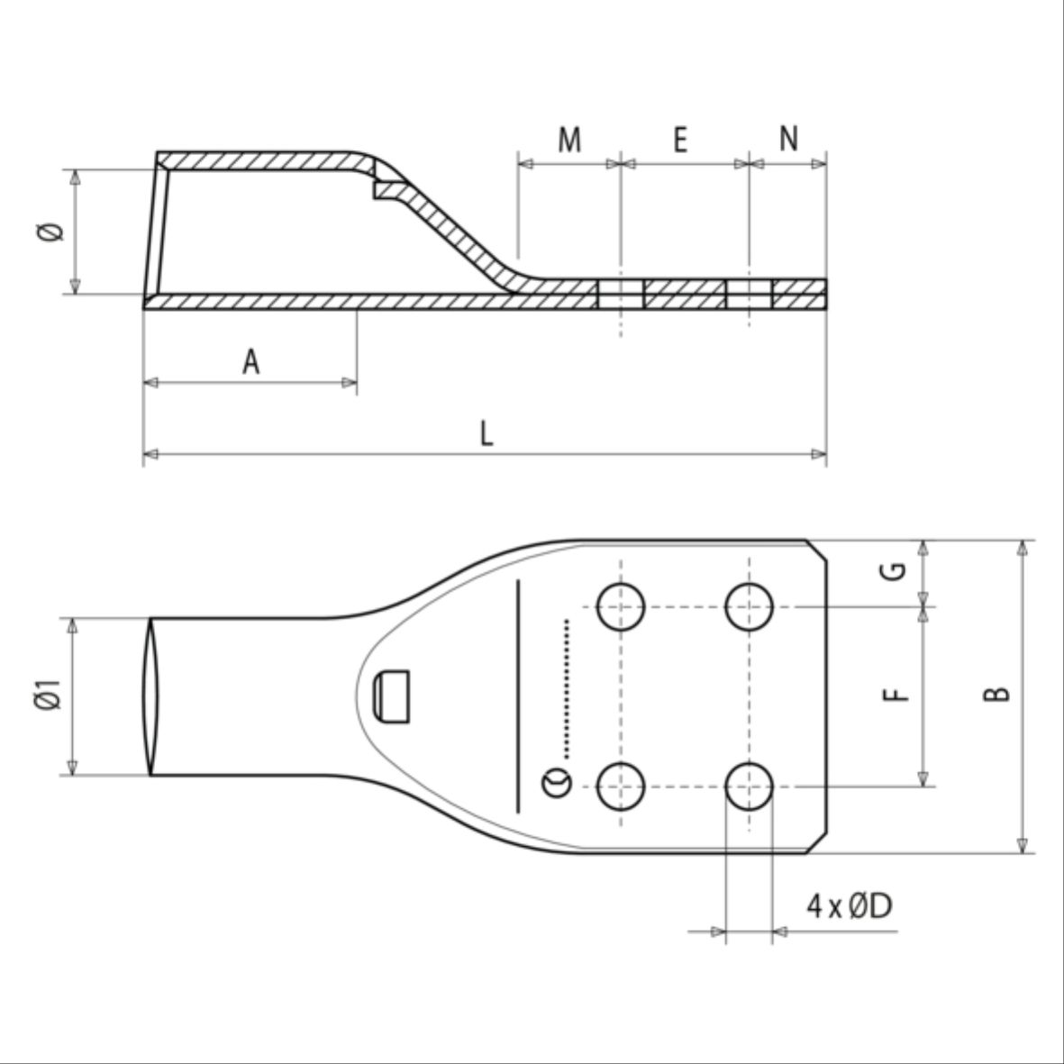 A-4ESI series lugs are made from electrolytic Copper tube with a purity greater than 99.9%, annealed and Tin plated. The four hole stud fi xing in acc
